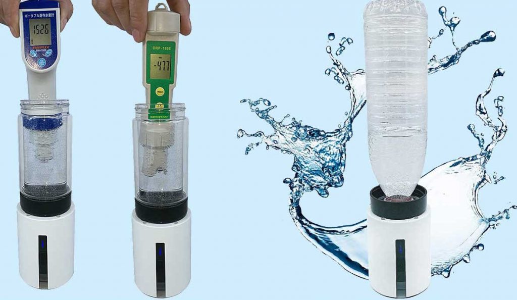 Cet appareil fonctionne en autonome car il possède une batterie. Il est livré avec un récipient de 370 ml mais il est ingénieusement équipé d’un adaptateur pour les bouteilles plastiques du commerce, ce qui lui permet de préparer jusqu’à 2 litres d’eau en une seule fois. Le temps pour obtenir une eau suffisamment chargée est d’environ 7 minutes par litre. La batterie permet plus de 20 cycles pour une charge en autonome soit 20 litres d’eau à boire. Les électrodes utilisées sont en titane, ce qui garantit plusieurs dizaines d’années d’utilisation sans problème. L’appareil est garanti 1 an et est aux normes CE, garantissant la qualité et le sérieux dans sa construction.